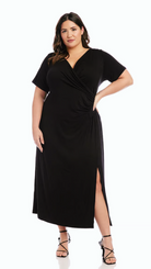 Elegant and alluring, this evening-ready midi dress is cut from fluid jersey-knit fabric and detailed with graceful draping. It's finished with a stylish side-slit.