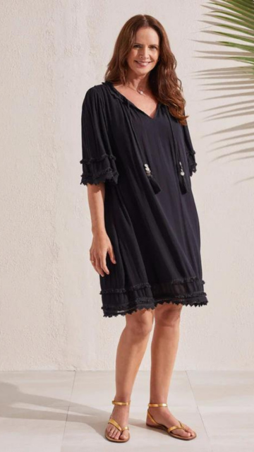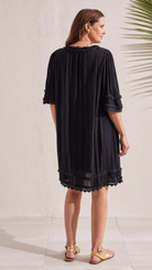 Achieve a breezy look with the Kaylani Dress. The notch neck design, short sleeves, and loose fit provide effortless comfort, while the woven crepe fabric adds a touch of elegance. Complete with decorative crochet trim, this shift dress exudes beachy bohemian style.
