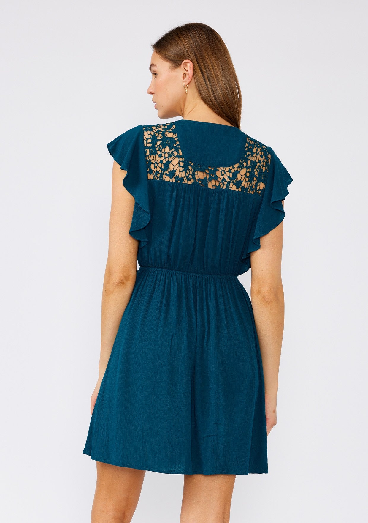 Discover your new favorite dress for the Spring season, the JOELLE DRESS! This mini dress features a faux wrap design with a beautiful upper crochet lace accent. The surplice v-neckline adds a touch of elegance, while the ruffled cascading sleeve adds a feminine touch. With its elastic waistline, this dress offers both comfort and style. Perfect for any occasion, this dress is a must-have for your wardrobe.