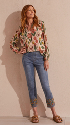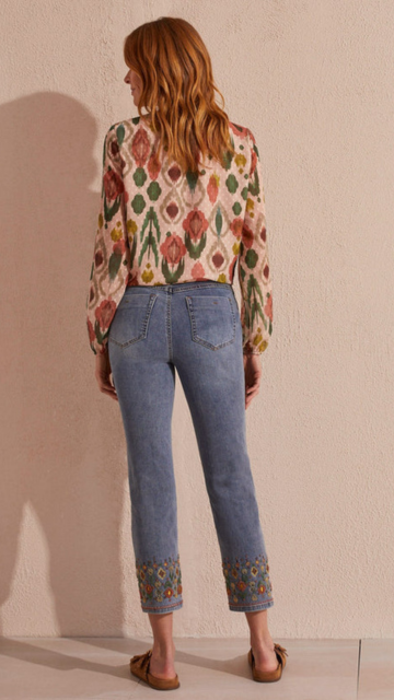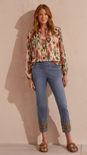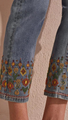 Introducing Elise Denim - the perfect blend of style and comfort. This pair of pull-on jeans features exquisite bead and embroidered details at the hem, adding a touch of sophistication to your everyday look. With a mid-rise waist, straight leg fit, and slight stretch, they are an effortless choice for any occasion.