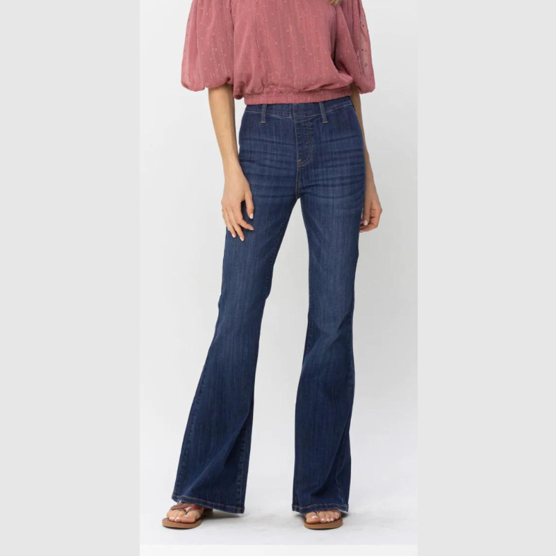 Upgrade your wardrobe with Judy Blue High Rise Flare Jeans. The high-rise fit and flare cut will enhance your figure, while the pull on elastic waistband provides comfort. Made with Judy Blue's signature durable fabric, these jeans are a stylish and practical choice.