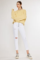 Discover the ultimate white denim with BILLY DENIM WHITE BY KANCAN. The girl friend fit, mid rise design offers a relaxed and comfortable fit, perfect for everyday wear. Made with a stretchy fabric blend for maximum comfort and flexibility. Featuring a trendy distressed look and exposed button, these jeans are a must-have for any fashion-forward wardrobe. With a rise of 8.5 inches and a length of 27 inches after double folding, they will provide the perfect fit in size 3/25. Upgrade your denim game with this stylish and versatile pair.