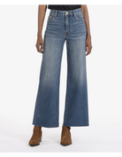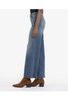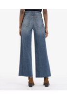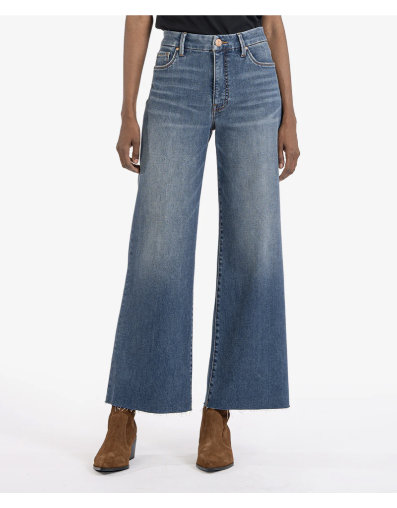 Elevate your wardrobe with our KG1516MC8 high-rise wide-leg jeans. These faded denim jeans feature raw hems and Fab Ab front pockets, designed to comfortably shape and slenderize your figure. A throwback look combined with modern technology, perfect for any fashion-forward individual.