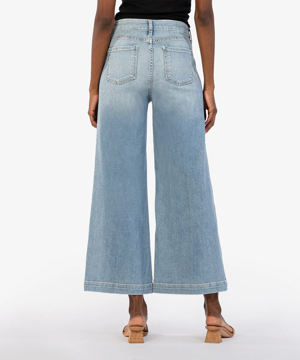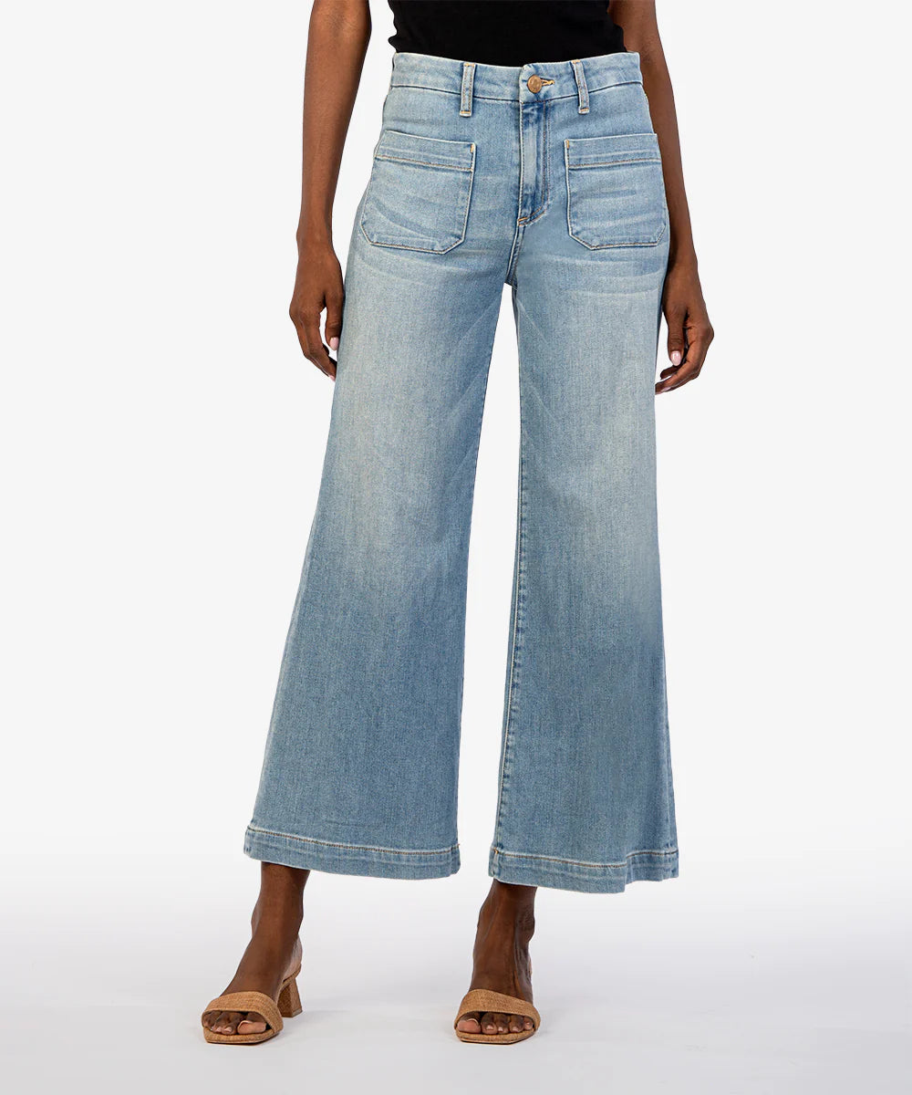 - Patch pockets in front amp the retro style of dramatic wide-leg jeans crafted from stretch denim.