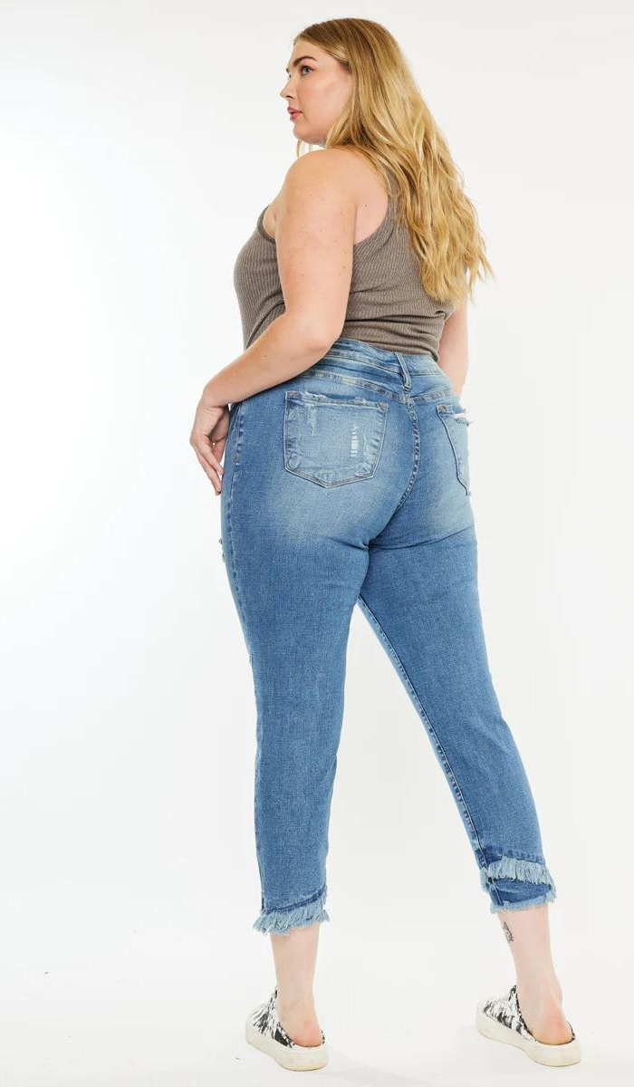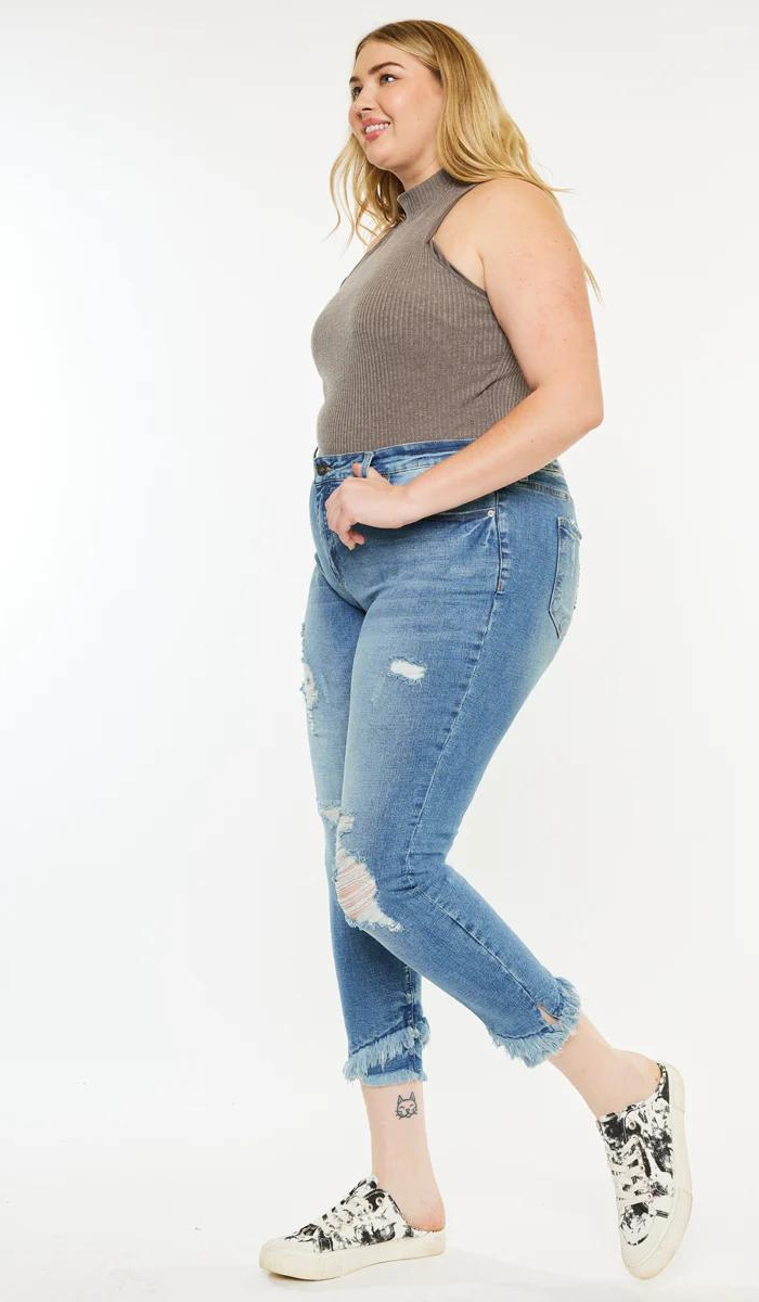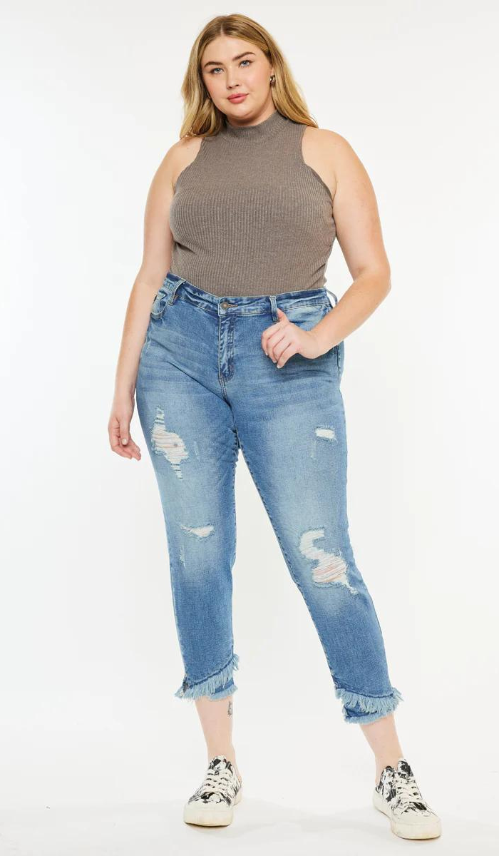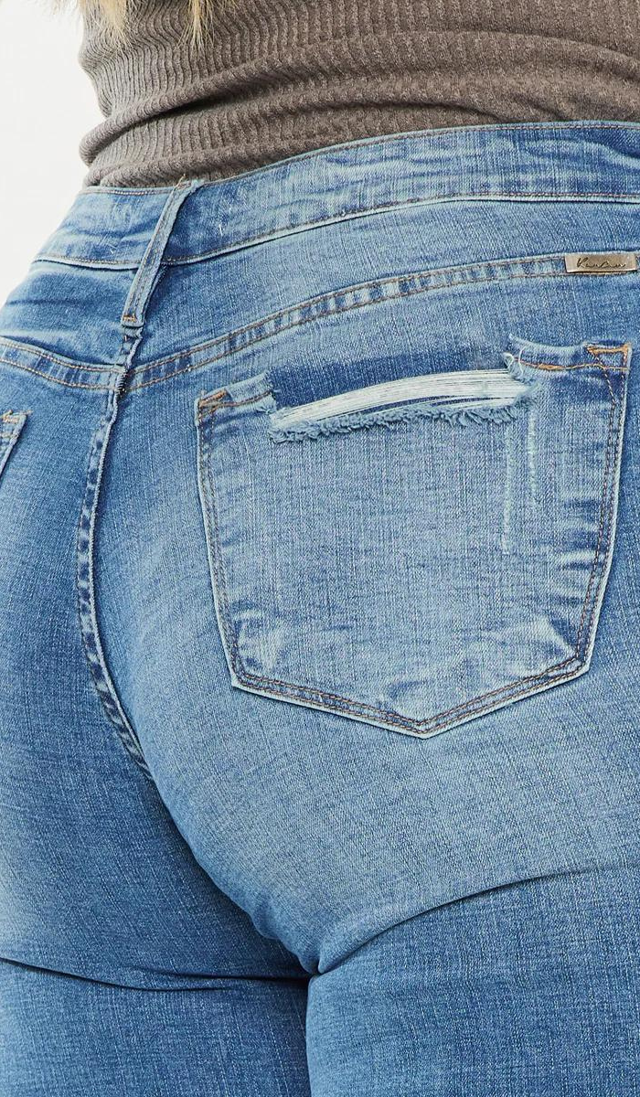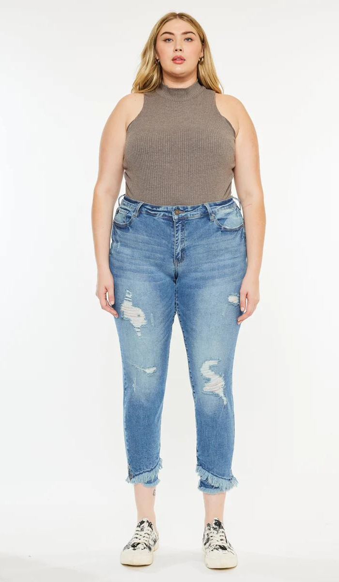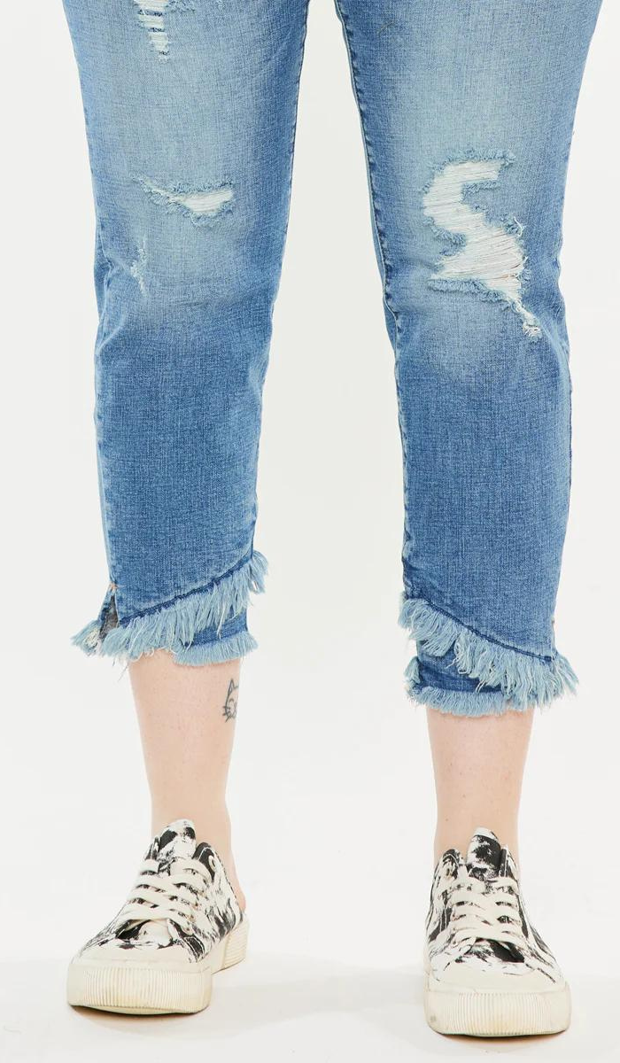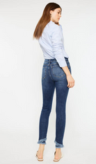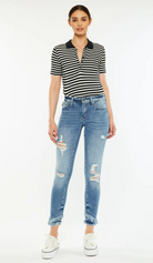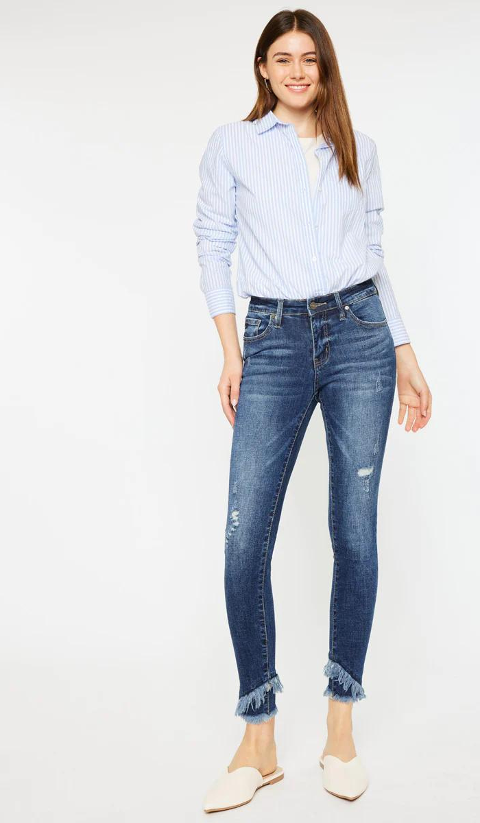 Enhance your wardrobe with the Lennon Denim - Medium by KanCan. These ankle skinny jeans boast a stylish double-layered frayed hem and distressed accents, while also providing a comfortable and flattering mid-rise waistline. With contrast stitching and a classic 5-pocket design, these jeans are a must-have for any fashion-forward individual.