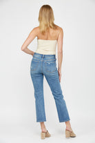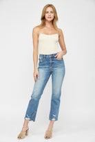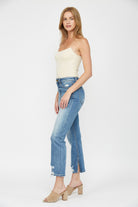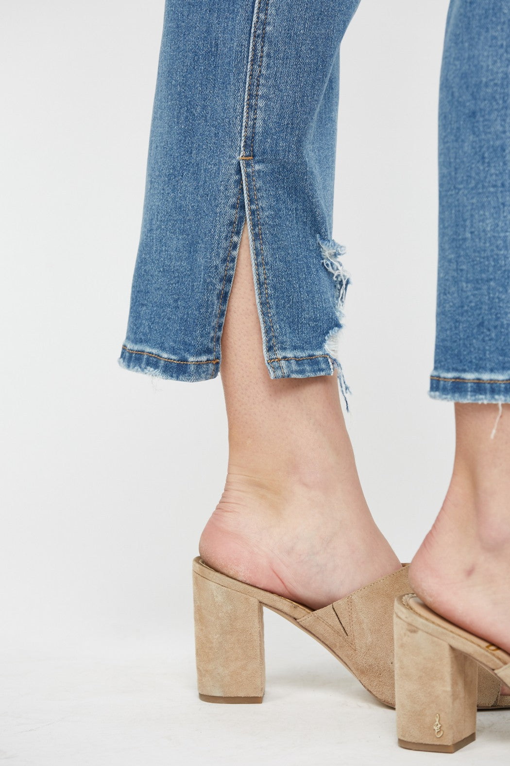 Stay on-trend with MAXI DENIM MEDIUM BY MICA DENIM. These high ankle straight jeans, featuring a stylish slit, are made with a comfortable blend of cotton, polyester, and spandex.