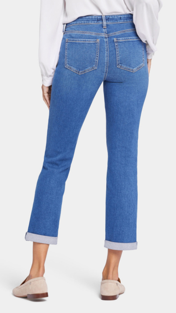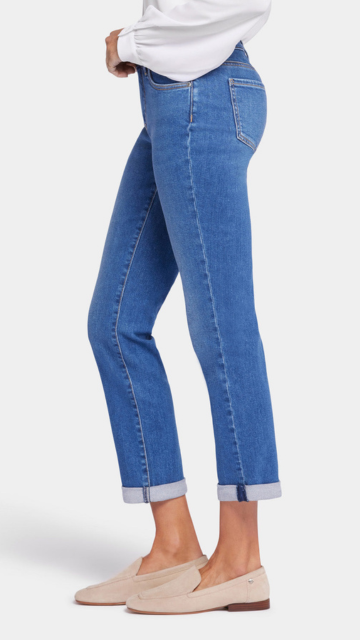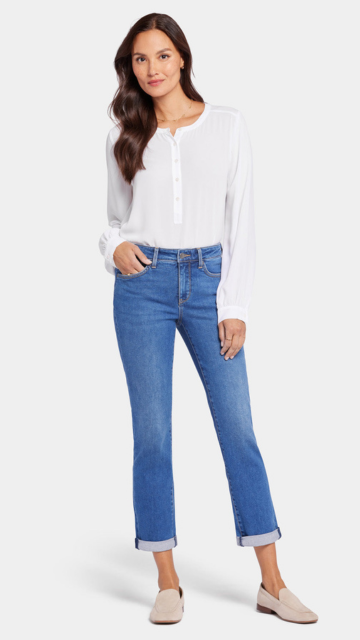 Prepare yourself for more than a few admiring stares. NYDJ’s Gia Slim Ankle Jeans with Roll Cuffs are an expertly cut fit that’s always in season. Lift Tuck Technology uses a proprietary slimming panel with a patented criss-cross design to shape and support your curves for an always-sleek silhouette. Features classic five-pocket styling, zip fly and button closure. This jean is made with earth-friendly methods that result in reduced consumption of water, chemicals and/or energy