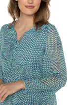 Embrace the changing seasons with the Willow Top. Made from double-layer crinkle chiffon, this beautiful blouse features a mix of yellow and green shades that mimic leaves. With pops of deep blue and a tie front detail, it's the perfect statement piece to pair with your favorite denim.