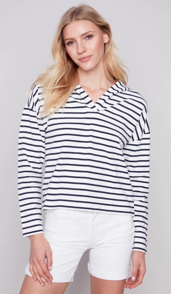 Elevate your wardrobe with the Celine Top. Made with soft baby terry cotton fabric, this striped shirt for women offers both comfort and style. The 3/4 sleeves and V neckline provide a flattering silhouette, while the stretch material allows for easy movement. Perfect for any spring or summer occasion.