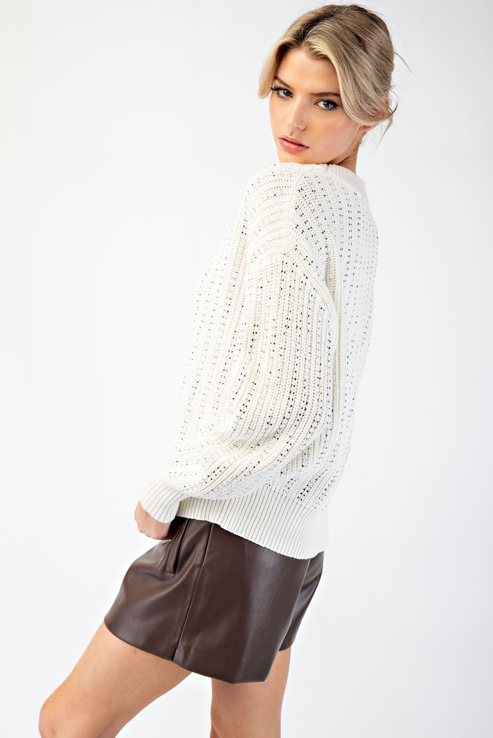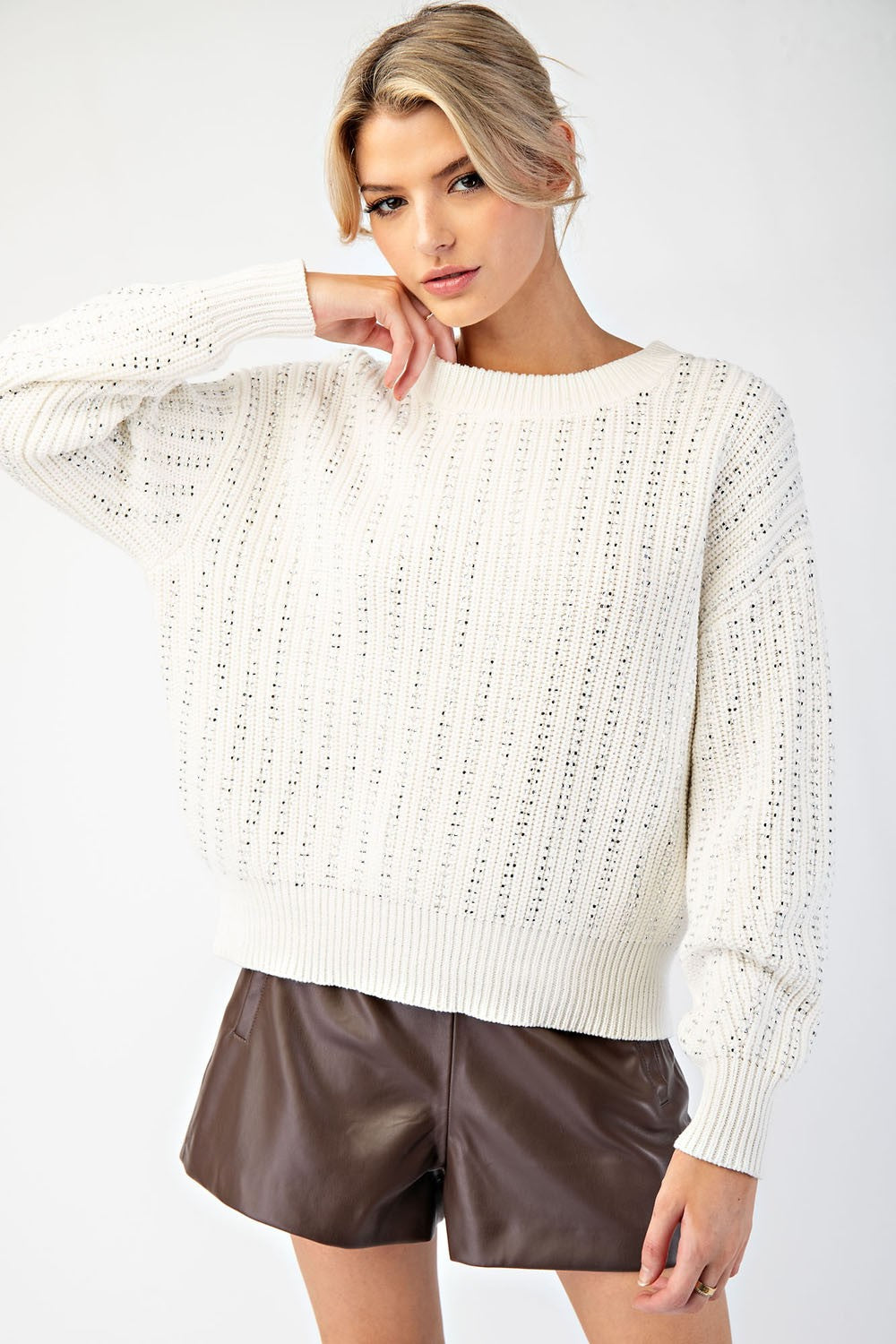 The GLIMMER SWEATER features long sleeves and jewel stud detailing for a touch of sparkle. With a rounded neckline and ribbed cuffs, this knit sweater offers both comfort and style. Dress it up or down for a versatile addition to your wardrobe.
