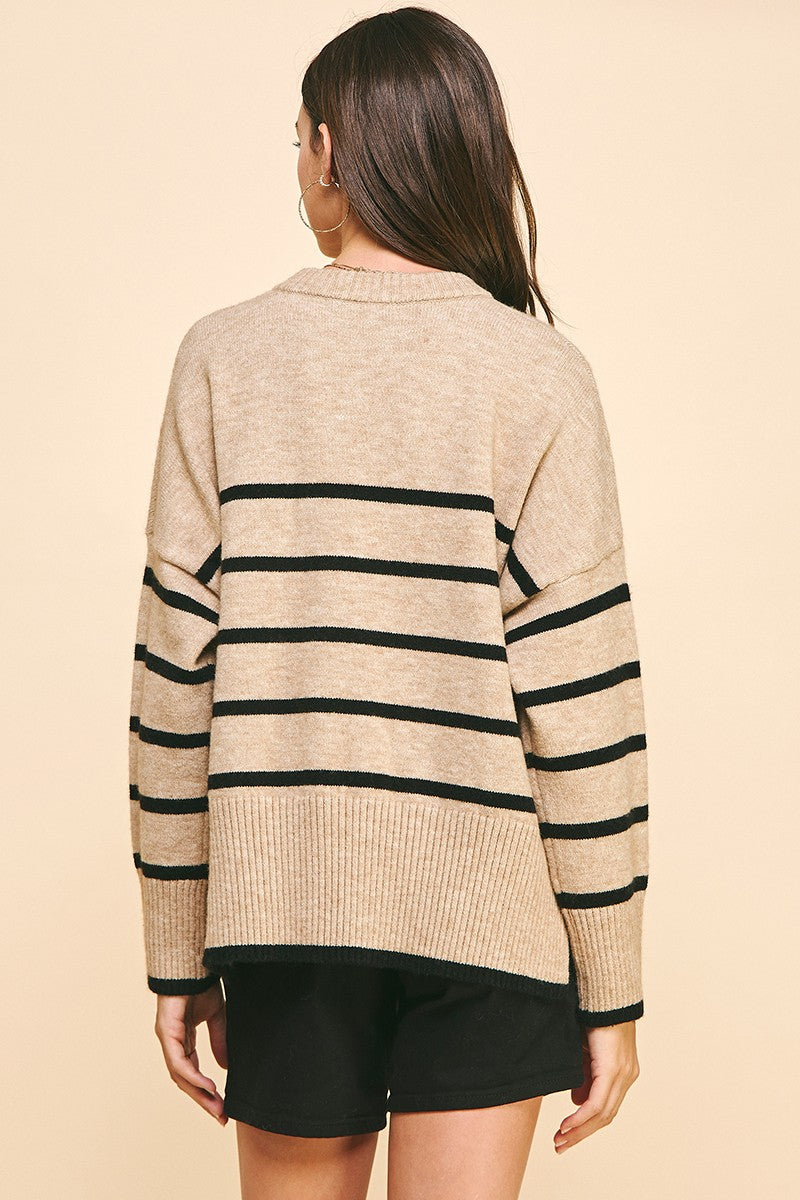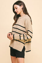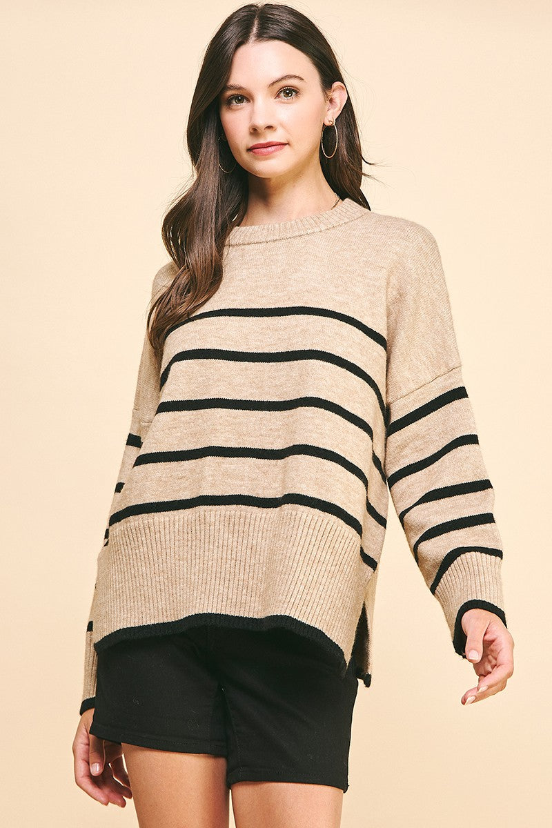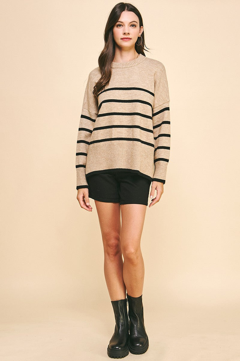 The JULIE SWEATER features a classic STRIPE PATTERN, offering a timeless and versatile design. Its CREW NECK and LONG SLEEVES provide a comfortable fit and added warmth. Perfect for any occasion, this sweater combines style and functionality for a must-have addition to any wardrobe.