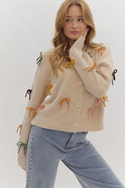 Solid long sleeve button down cropped cardigan featuring multi colored bow appliques. Unlined. Knit. Non-sheer. Lightweight.