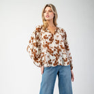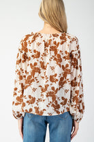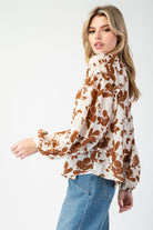 This floral printed long sleeve blouse top is crafted from a lightweight, crinkle fabric. The ruffle smocked neck adds a touch of elegance, while the button down front with loop holes and elastic cuffs provide a comfortable fit. Perfect for adding a feminine touch to any outfit.
