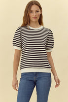 Striped top with U-neck, short puffed sleeves and ribbed hems.