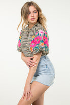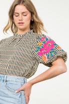 This STELLA BLOUSE features a high neck and embroidered puff sleeves, adding a touch of elegance to the classic striped top. Made in the USA, this blouse combines style and quality for a sophisticated look. Elevate your wardrobe with this versatile and timeless piece.