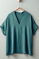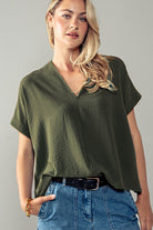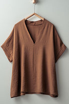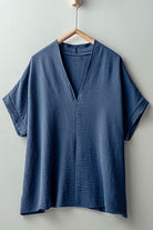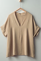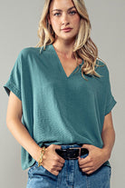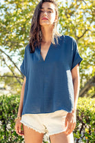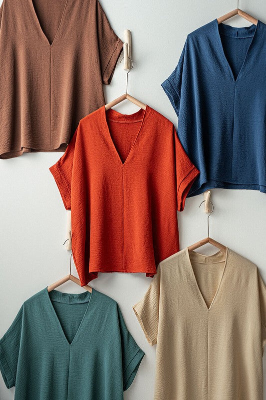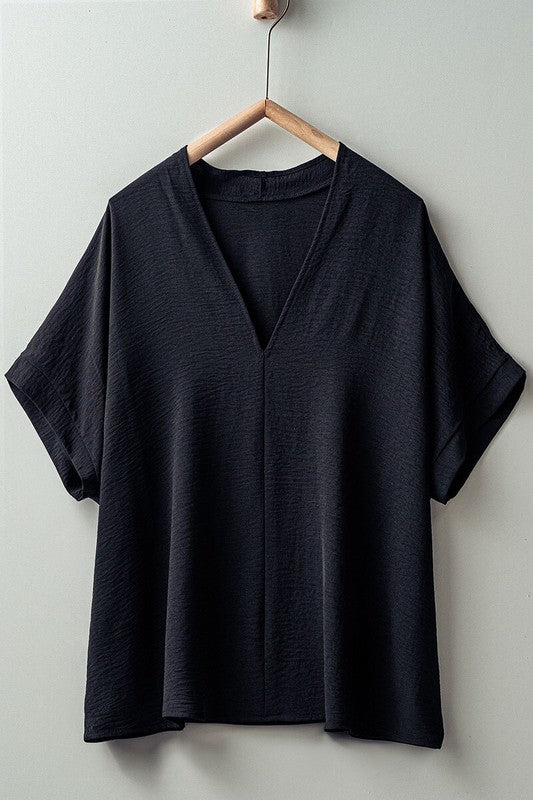 COCO TOP is an oversized v-neck top with folded short sleeves. Made in the USA, it offers a comfortable and lightweight fit. Perfect for any occasion, this top is both stylish and versatile.