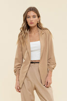 Introducing the JUILETTE BLAZER. With its notch and shawl collar options, this blazer offers versatility and style. The 3/4 ruched sleeves add a unique touch that elevates any look. Expertly crafted for a polished and professional appearance.