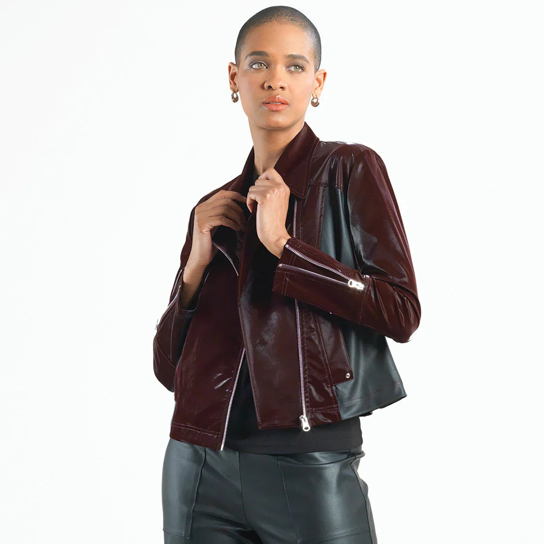 Gloss up your wardrobe and shine through in our Vinyl - Liquid Leather Panel Zip Cuff Pocket Jacket! The first of its kind from Clara Sunwoo features a silver asymmetrical zip closure with a standard collar and notched lapel, satin-like interior lining, long sleeves with zip cuff closures and seam work, side pockets with snap details, and black front and back panels made from our soft-sheen liquid leather fabric for an upscale contrast.