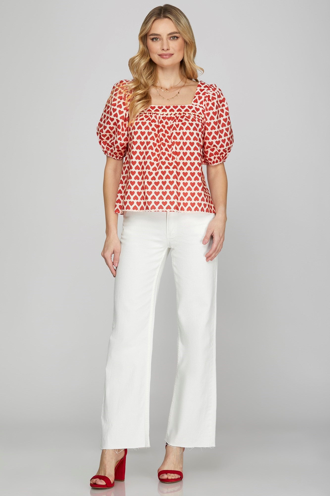 Spread love wherever you go with our Jolene Top! This short-sleeved blouse features a playful red and white heart pattern, while the super soft fabric ensures maximum comfort. A must-have for any casual or dressy occasion.