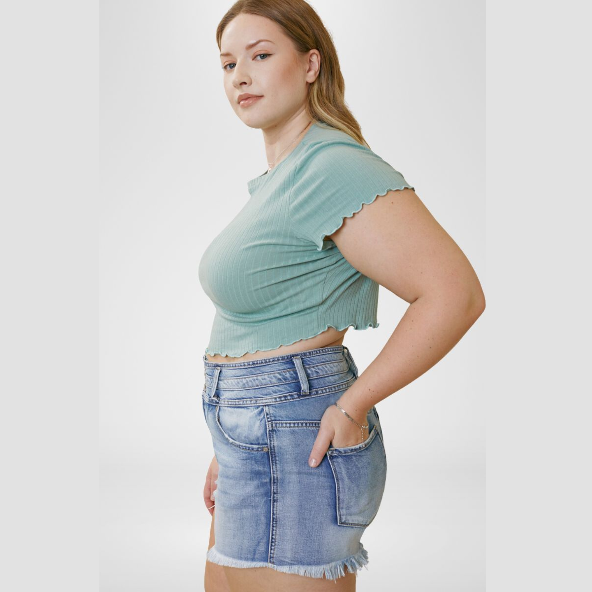 KanCan plus size high rise shorts. Has a triple button band. Distressed fringed bottom hem.