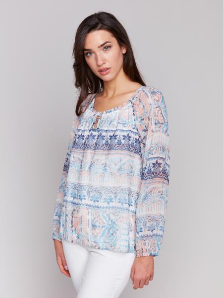 Introducing the Remy Top - your new obsession. With a stunning print and intricate details, this top is the perfect addition to any outfit. Pair it with your go-to denim and heels for a complete and stylish look. Say goodbye to boring tops and hello to the Remy.