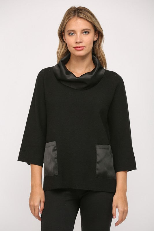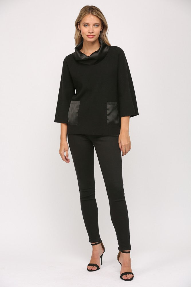 Add some shine to your wardrobe with our Amber Top! We love the allover finish on this piece complete with a scoop neckline featuring pocket detailing at the front with coordinating fabric pockets. Finished with bell sleeves and a satin cowl neck, it has a relaxed fit for the perfect silhouette. Pair with leather pants and your favorite kitten heels for a chic, sparkly look!