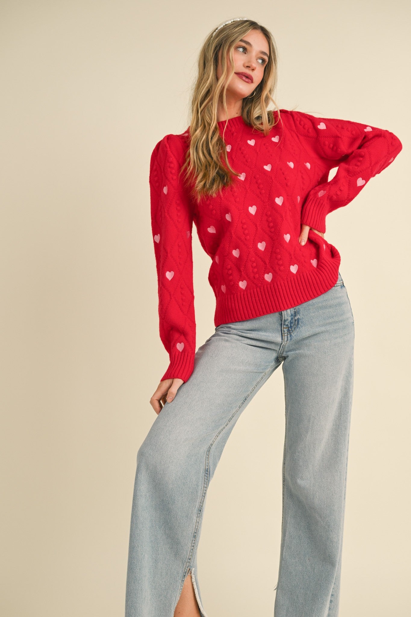 Get ready for some serious sweater love with the Chloe Sweater! This adorable knit top features charming embroidered hearts and playful pom pom accents, and the ribbed round neckline and gathered puff shoulders add a touch of fun and flair. Stay cozy and chic with the ribbed sleeve cuffs and hem.