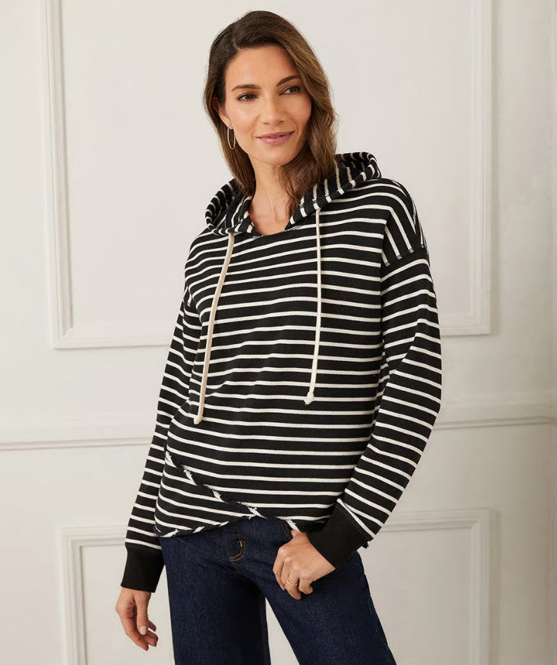 Expertly crafted with a French terry material, our Stripe Asymmetric Hem Hoodie offers both comfort and style. Its unique asymmetrical design adds a touch of casual flair to your everyday wardrobe.