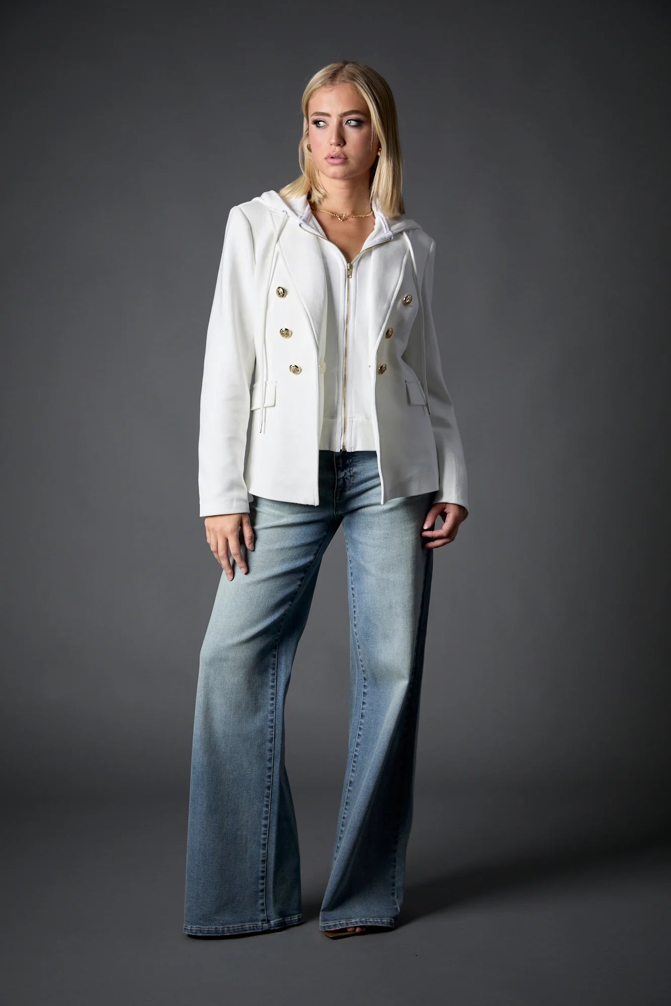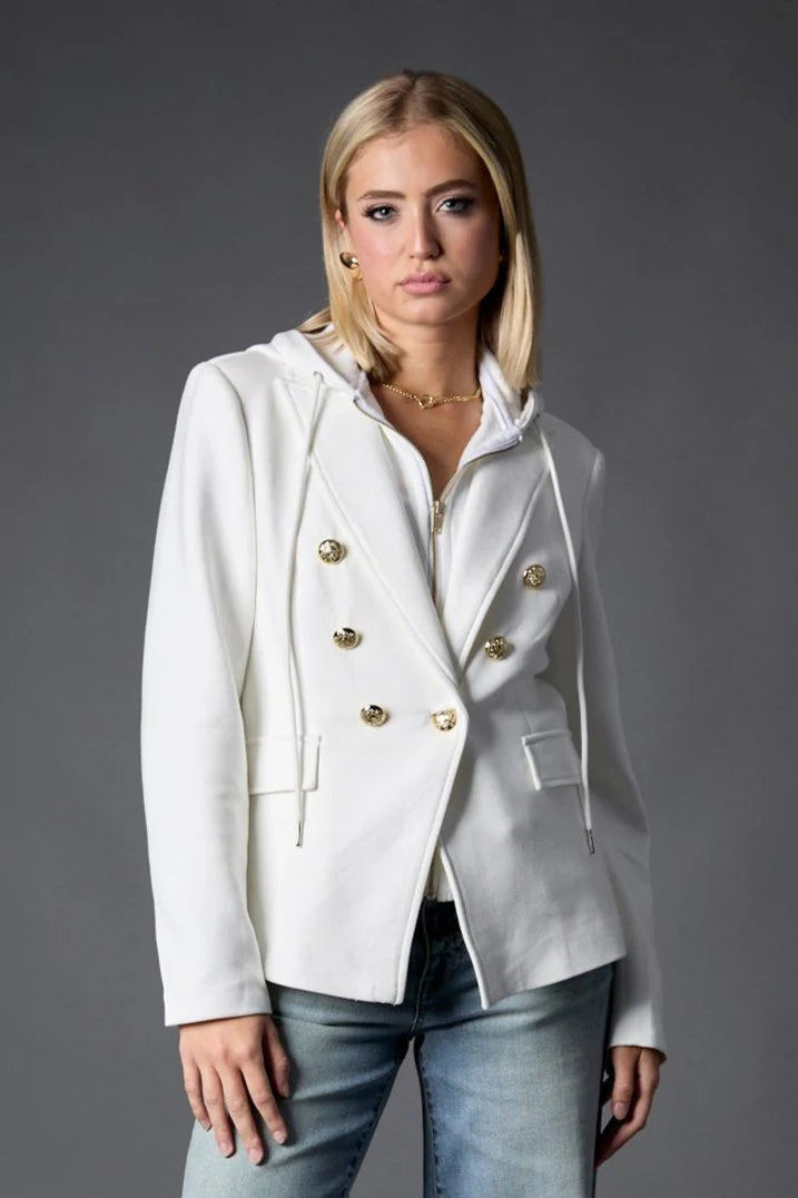 Our Bianca Double Breasted Blazer is crafted in NEW lightweight stretch-suiting fabric and detailed with 2 closures. The White Hoodie insert can be easily zipped out for twice the styling. This scuba fabric is so soft you'll want one in every color.
