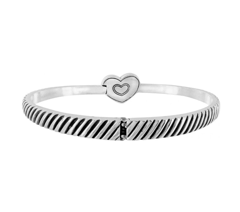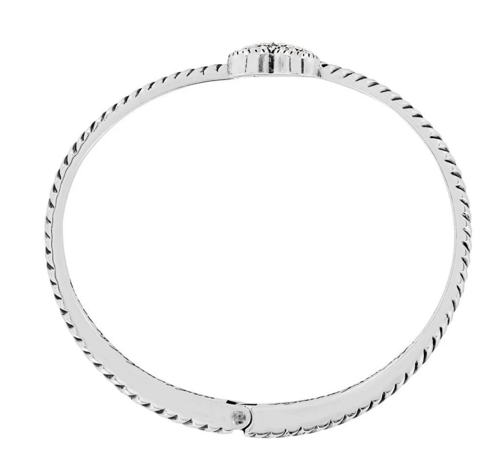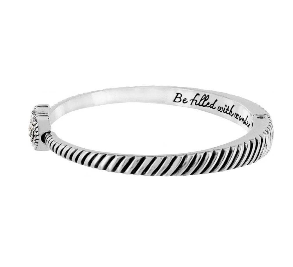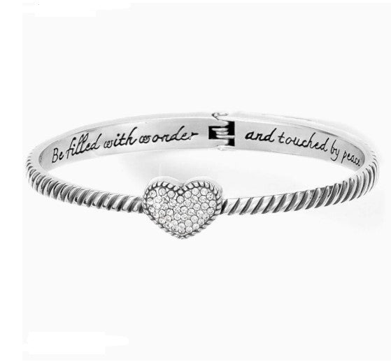 The Celestia Heart Hinged Bangle from Brighton captures the beauty of the constellations and encourages inner peace with its etched inscription. Made with fine quality crystals, this silver plated bracelet features a secure magnetic hinge closure and a sleek 1/2" width. Diameter measures 2 1/2". Warranty included.
