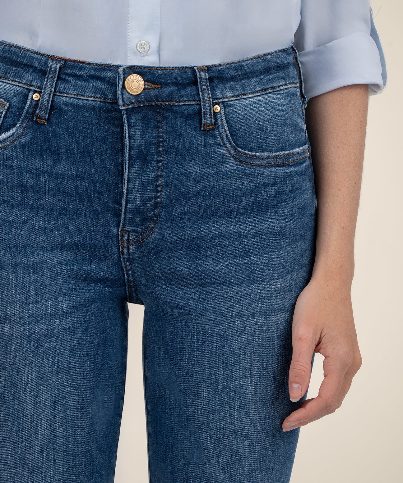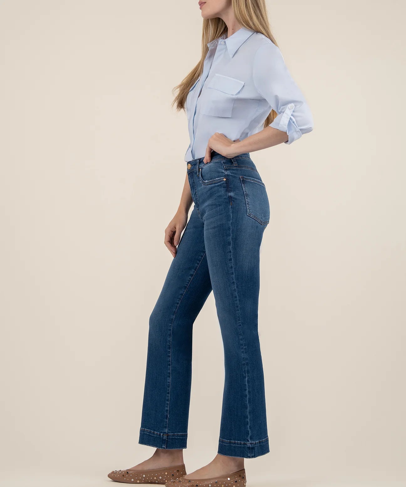 These CELINE DENIM jeans by KUT FROM THE KLOTH are a must-have for any denim lover. With a classic faded-indigo wash, ankle length flare, and trouser-style hems, these jeans offer a stylish and versatile look. The Fab Ab front pockets not only add visual appeal, but also provide comfort and a flattering fit. Made with a blend of cotton, polyester, and spandex, these jeans are both comfortable and durable for everyday wear.