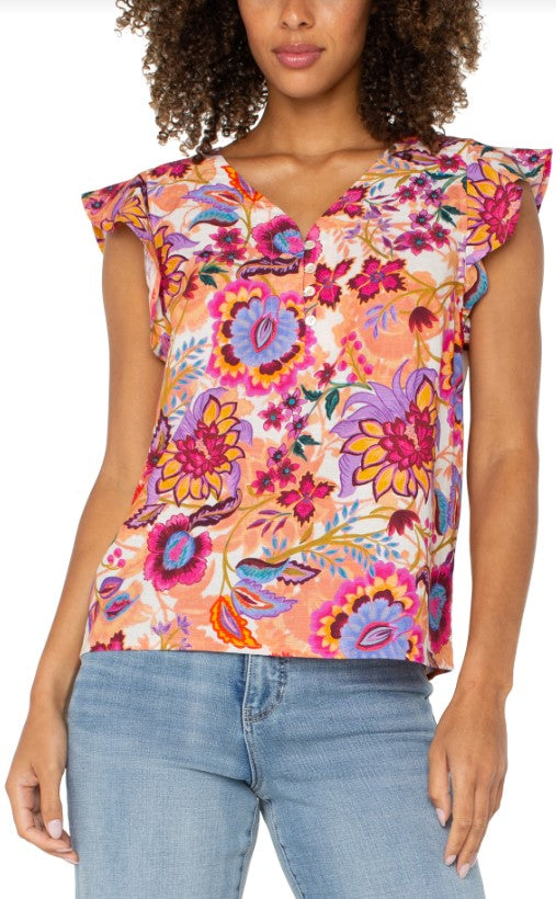 Introducing the Corrina Top, a blooming beauty from LIVERPOOL! With flutter sleeves and a floral pattern, this top is perfect for adding a touch of whimsy to any outfit. Let your style blossom with the Corrina Top!