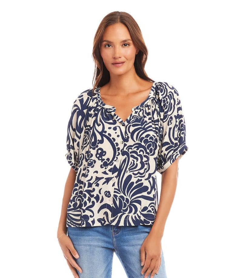 Expertly crafted from light crepe material, this short sleeve peasant top is perfect for transitioning seamlessly from work to a casual night out. The whimsy paisley print adds a touch of charm, while the flowy design is ideal for warmer days. Versatile and stylish, this top is a must-have for any wardrobe.