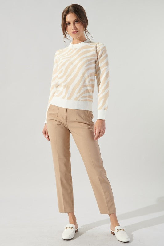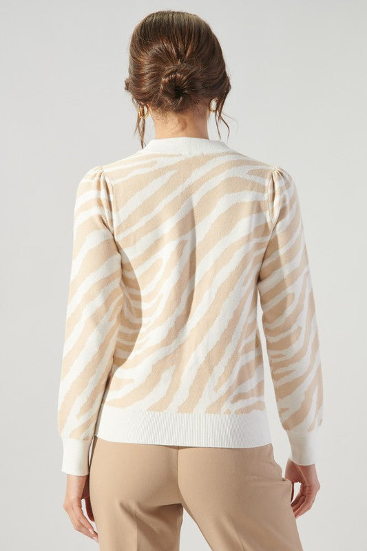 NEW ARRIVAL! This zebra print sweater in the most gorgeous neutral tones features the softest knit fabrication that wears and washes beautifully. We love the print down to add a fun pop of print . Pair with your favorite jeans for a look you will be wearing on repeat!