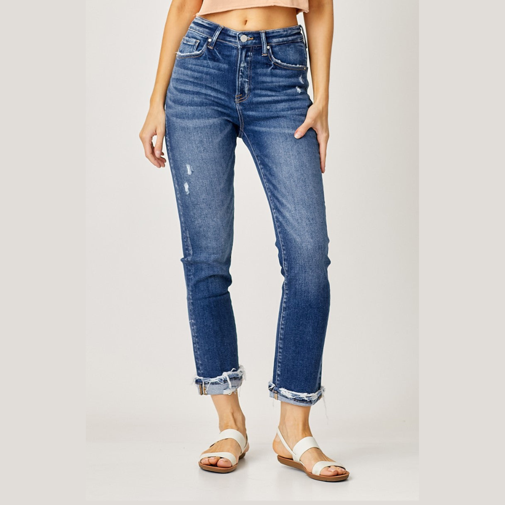 Elevate your denim game with GOLDIE DENIM DARK BY RISEN JEANS. These high-rise cuffed straight jeans offer a flattering fit and stylish look. Made with quality denim, they provide both comfort and durability. Perfect for dressing up or down, these jeans are a versatile addition to any wardrobe.