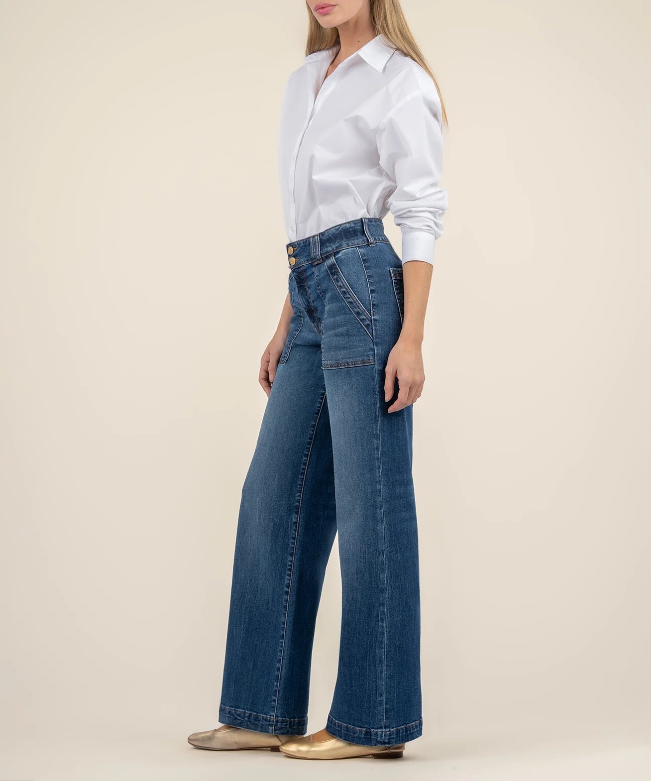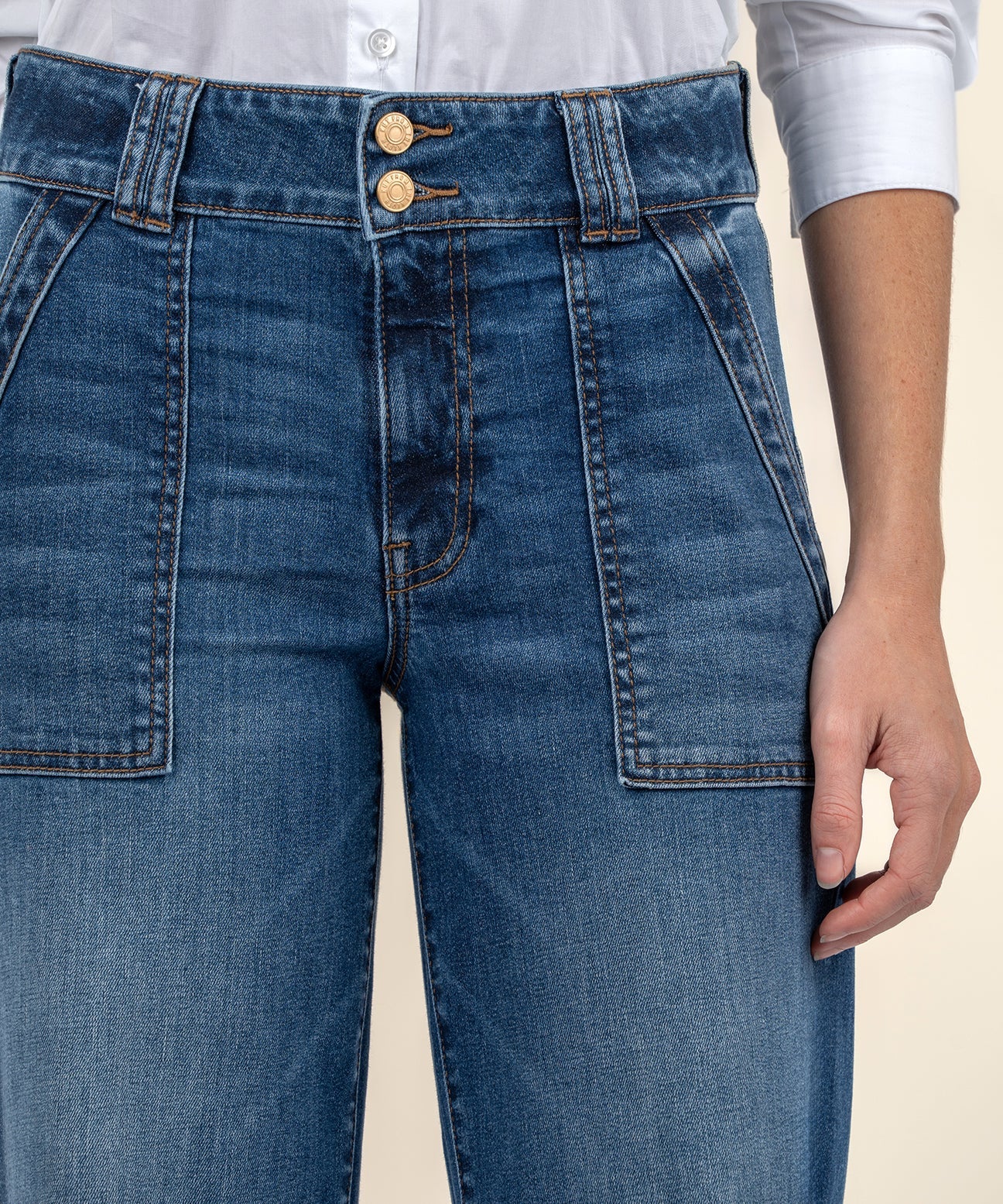 Elevate your wardrobe with the Jodi jeans by KUT. These vintage-inspired jeans feature patch pockets, wide legs, and a touch of stretch for a comfortable fit. With a nod to the '70s, these perfectly faded jeans bring a touch of nostalgia and timeless style to your look.