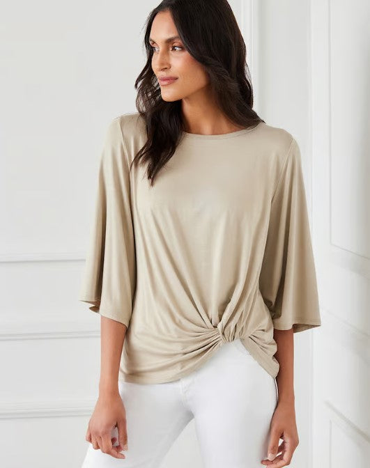 Elevate your wardrobe with the Priscilla Top. The flouncy flare sleeves make a statement, while the twist hem adds a touch of sophistication. Crafted from luxurious Rayon Spandex Jersey, this top effortlessly transitions from day to night. by Karen Kane.