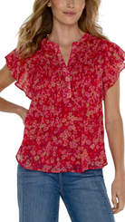 The Charli Top is a versatile addition to any wardrobe. Made with lightweight double layered chiffon, it offers a comfortable and chic fit. The beautiful print and flutter sleeves add a touch of femininity, and it can be paired with a denim jacket or worn on its own for a stylish look.