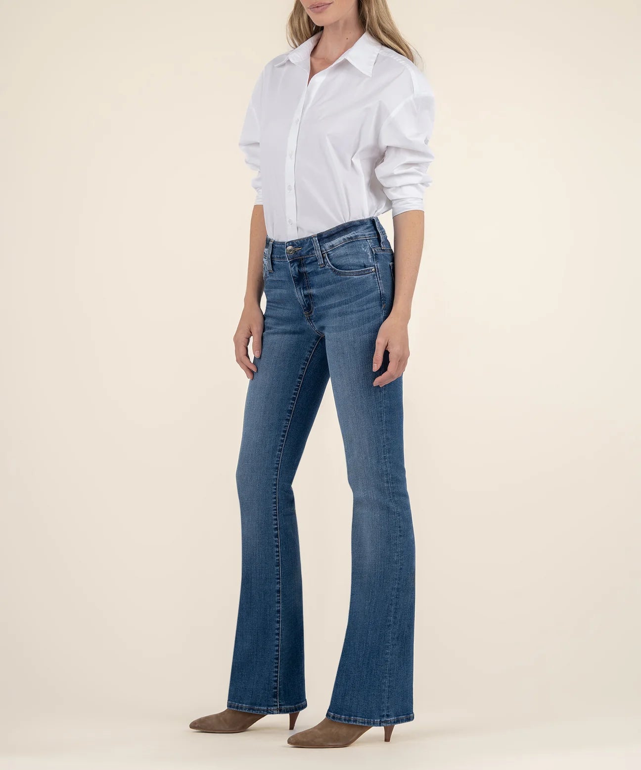 Elevate your wardrobe with the Madison jeans by KUT. These premium bootcut jeans offer a sleek transition from day to night, with a versatile blue wash and subtle pocket destruction. The mid rise fit flatters your figure, while the flared hems add a touch of sophistication.