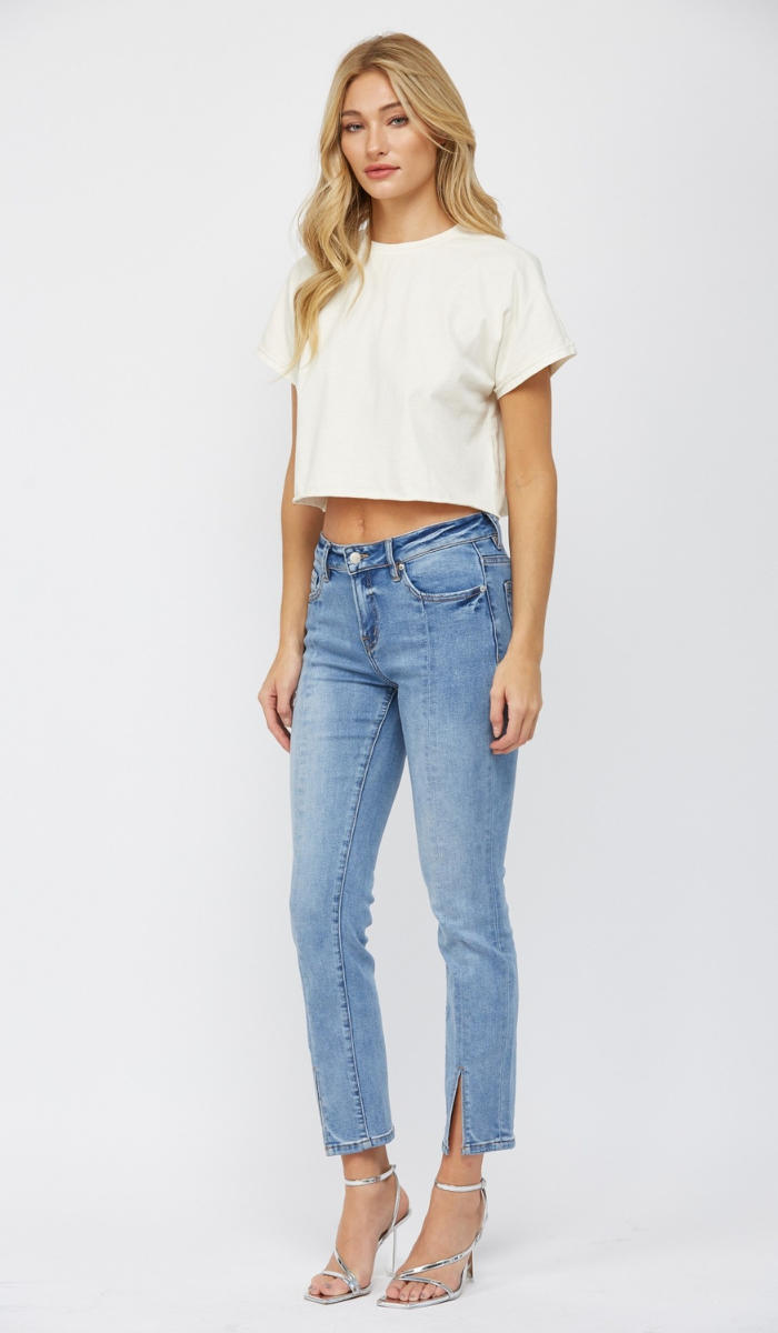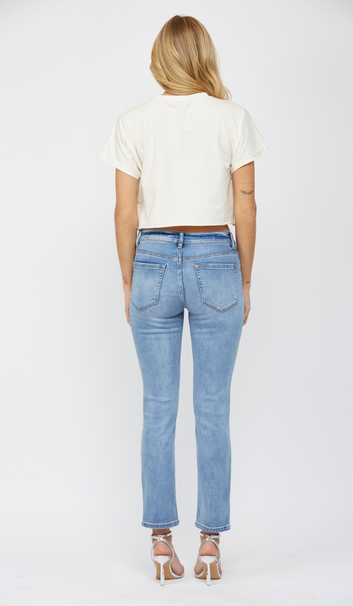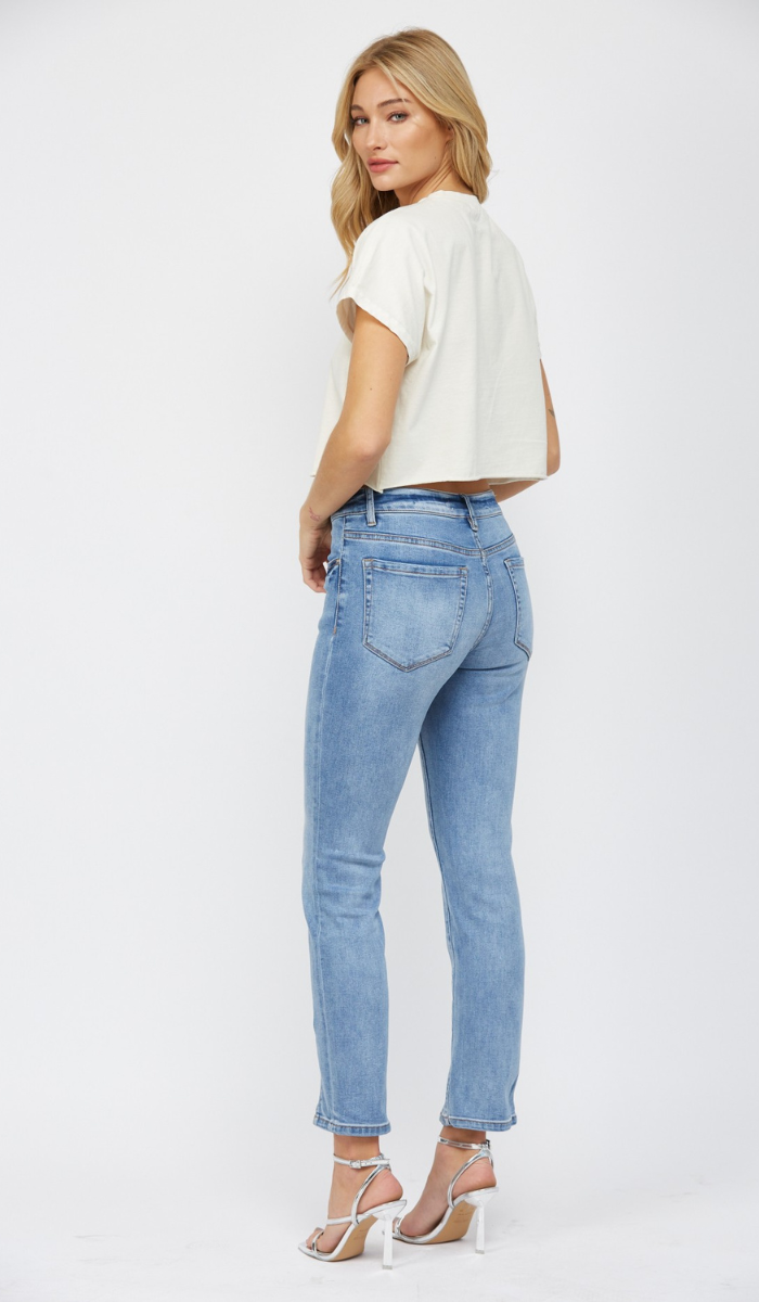 Introducing the Freya Jeans - Light by Mica. Featuring a slimming mid-rise fit and a stylish crop straight leg cut, these jeans are made from a comfortable blend of cotton, viscose, polyester, and spandex. With a front rise of 9%, you can flaunt your figure with confidence.