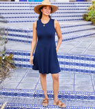 Effortlessly flattering, this sleeveless fit-and-flare dress is crafted from a rayon spandex jersey that offers structure with a touch of stretch. Featuring front and back center seam detailing for subtle definition, it’s finished with convenient side pockets—perfect for everyday ease with a polished twist.