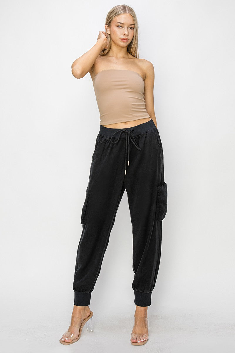 Elevate your wardrobe with our MILLY Drawstring Cargos. Crafted with high-quality Tencel fabric, these black cargo jogger pants offer both style and comfort. The high rise design flatters your figure while the drawstring waist ensures a perfect fit. Upgrade your look with ease and confidence.