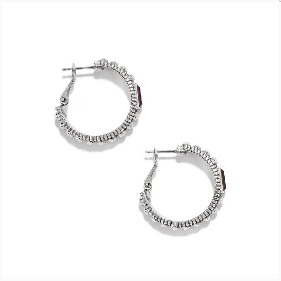 The Pretty Tough Gem Hoop Earrings combine modern and ancient beauty with intricate granulation and hand-set crystals, inspired by Byzantine jewels and Theodora's mosaic portrait. Crafted with a post and lever back, these refined earrings provide a secure and stylish accessory. Silver plated with a 1" drop and 1/4" width.